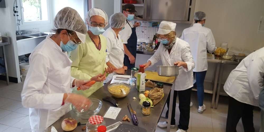 La mission a été confiée à Jérôme Rouzade, chef au collège de Belvès (premier collège 100 % bio de France) et cuisinier-formateur du collectif Les Pieds dans le plat, qui a assuré sa toute première formation, épaulé par le référent Jean-Marc Mouillac. Des éléments théoriques sur l’agriculture biologique ont été apportés dans un premier temps par Agrobio Périgord. Les dix cuisinières sont ensuite passées à l’action et par petits groupes ont réalisé et réussi une dizaine de recettes, de l’entrée au dessert.