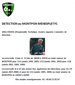 Les mercredis 8 et 15 juin auront lieu également des détections pour les U9 (année 2007, 2008) et pour les U11 (année 2005, 2006) au stade annexe de MONTPON de 14H00 à 16H00