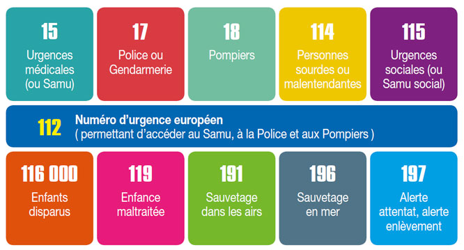 Il existe dorénavant 11 numéros d’urgence gratuits. Les opérateurs de téléphonie sont tenus d’acheminer gratuitement ces appels d’urgence et de les géolocaliser lorsque cela s’avère possible.