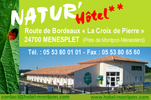 Hôtel d’affaires et de tourisme situé sur l’axe principal Bordeaux-Périgueux par la D6089 à 3 km de Montpon. Natur’hôtel vous propose 20 chambres construites dans le respect de l’environnement. Ouvert toute l’année, tous les jours.
