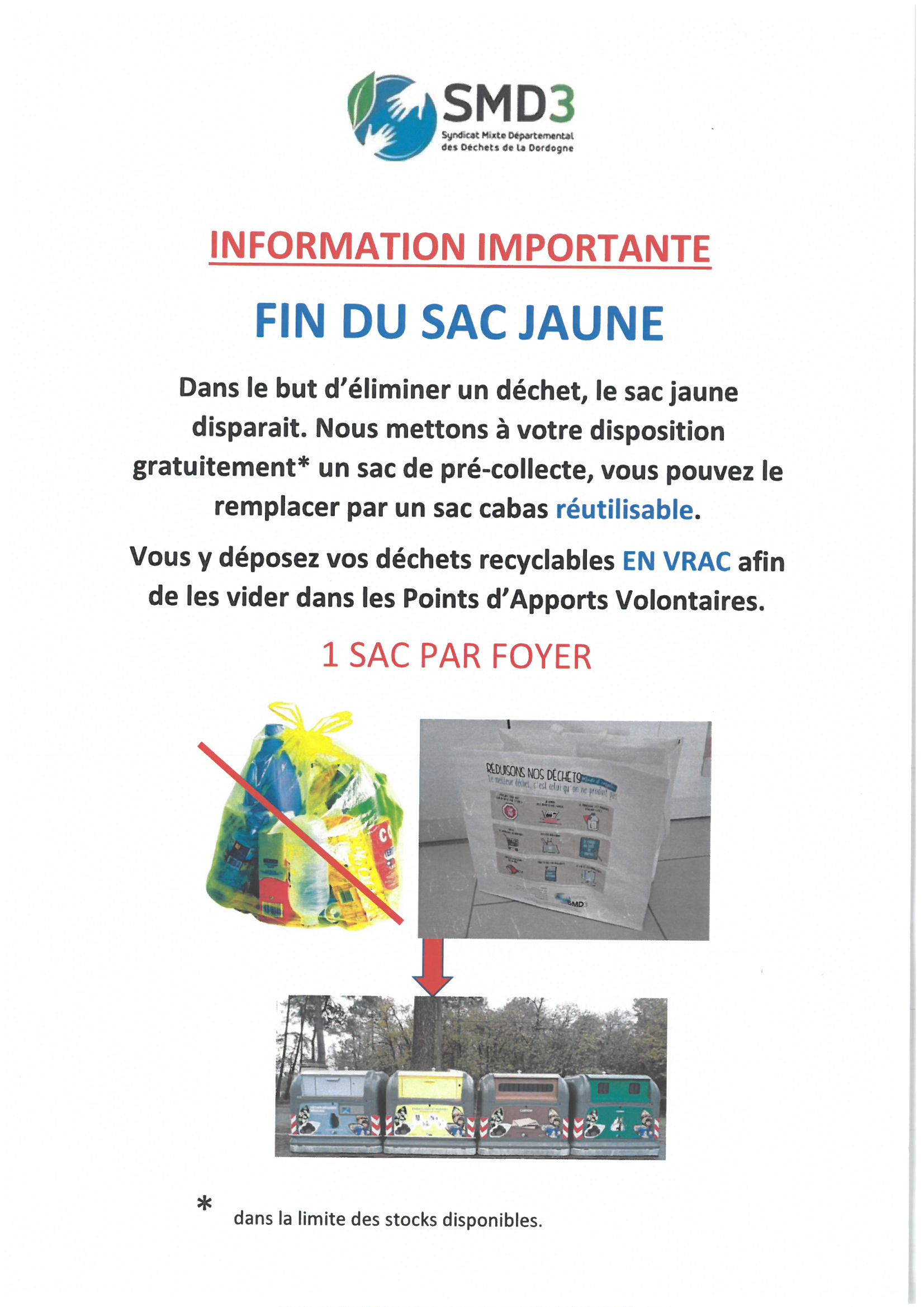 Fin du sac jaune. Les déchets recyclables doivent être mis en vrac dans les bornes concernées. Le SMD3 vous fournira un sac cabas réutilisable pour ces déchets. Un sac cabas réutilisable de supermarché peu également convenir pour cet usage.