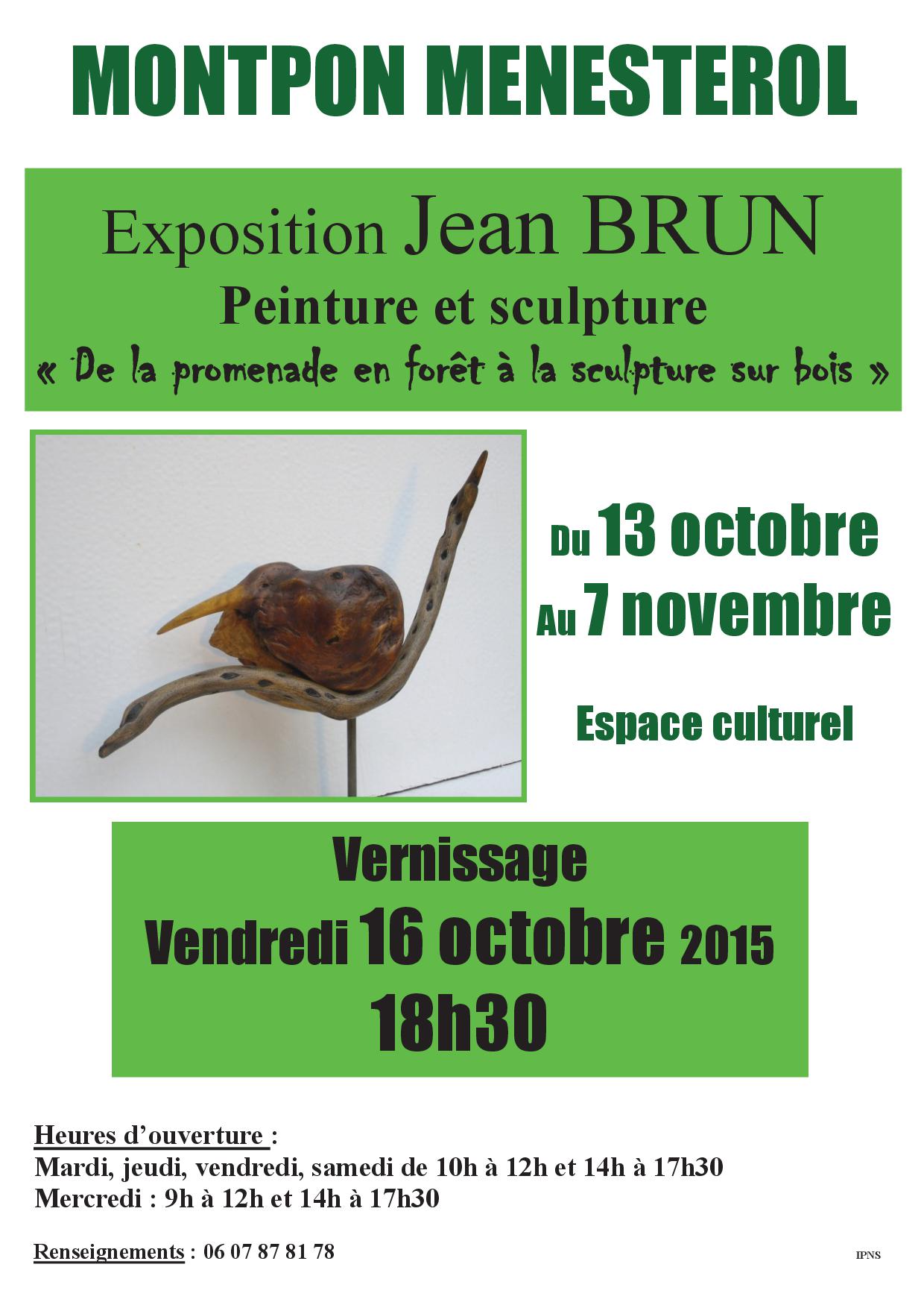 EXPOSITION Jean BRUN – Peintures & sculptures Du 13/10/2015 au 7/11/2015 Espace Culturel Antoine de Saint-Exupéry Rue de Verdun – 24 700 Montpon-Ménestérol Vernissage : Vendredi 16 octobre 2015 à 18h30 Tél. : 05 53 82 30 54 – Expositions Tél : 06 07 87 10 78 Mardi – jeudi – vendredi – samedi : 10h/12h et 14h à 17h30 Mercredi : 9h à 12h et 14h à 17h30