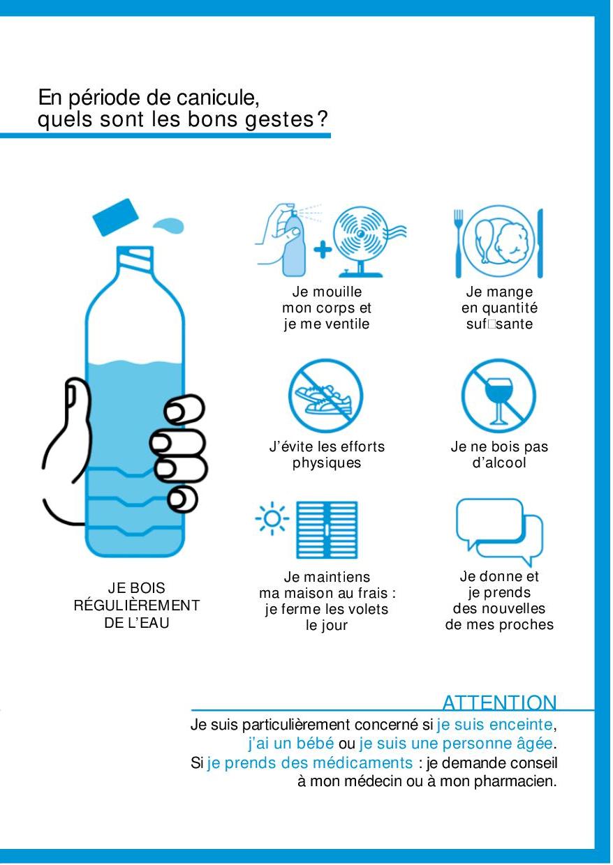 • Se rafraîchir régulièrement en se mouillant la peau avec des linges humides, en utilisant des vaporisateurs, en prenant des douches fraîches ;