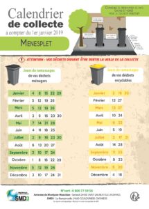 Calendriers 2019 de collecte des déchets ménagers pour la commune de Ménesplet. Version pdf imprimable.