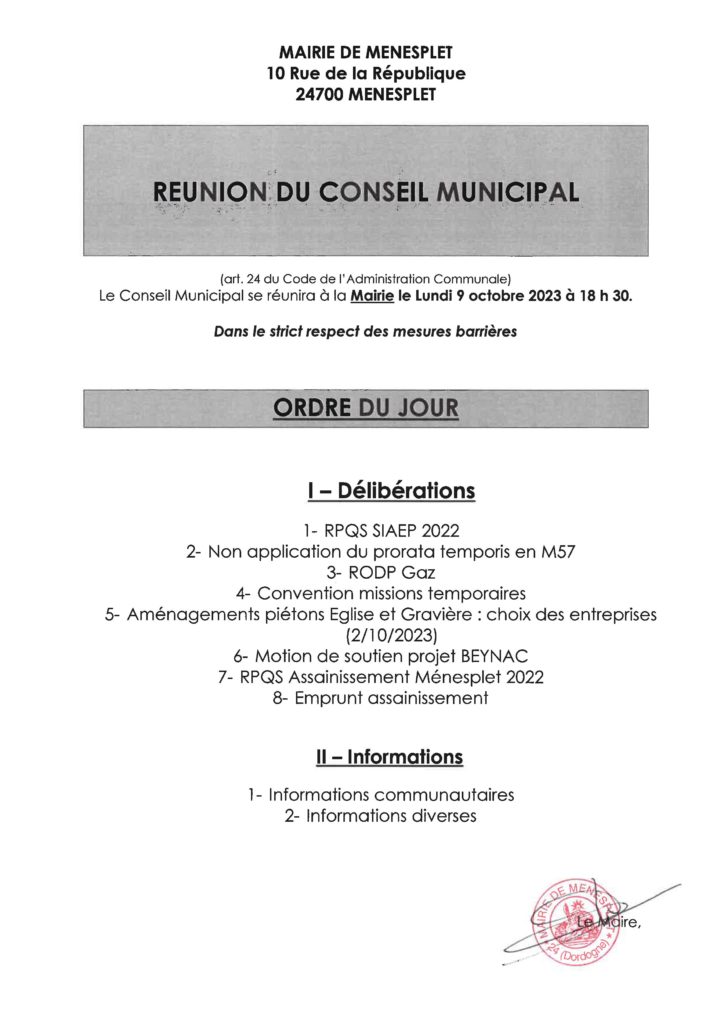 Accueil → Actualités → Conseil Municipal le lundi 9 octobre à 18h30