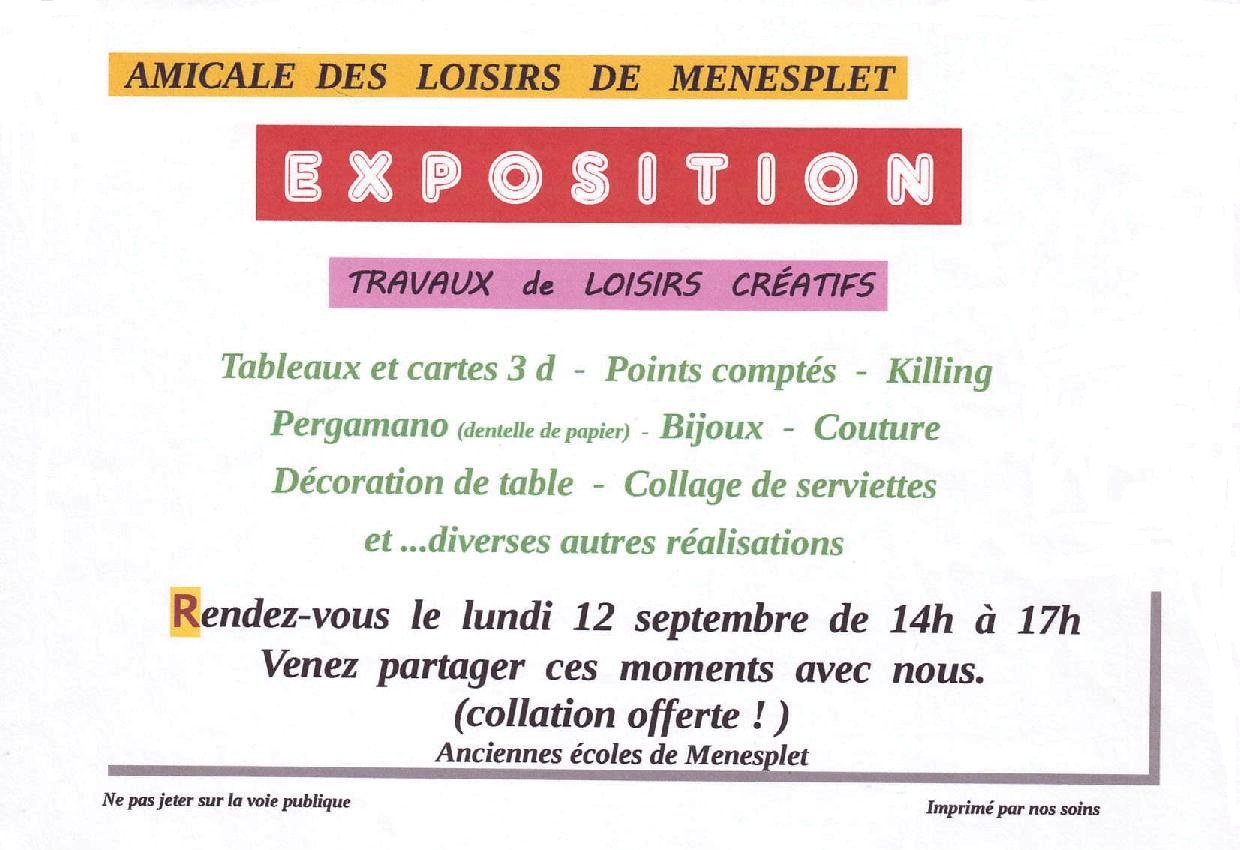 Exposition loisirs créatifs, lundi 12/09 de 14h à 17h, à Ménesplet