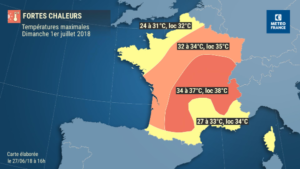 Lundi 2 juillet, le seuil des 30 °C devrait encore être très souvent atteint sur l’ensemble du pays. Les très fortes chaleurs devraient se maintenir dans le Centre-Est, avec une hausse probable des températures dans le Nord-Est.