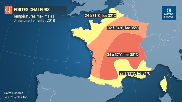 Samedi 30 juin, les températures maximales seront comprises entre 32 et 37 °C du Sud-Ouest au Centre-Est, et entre 27 et 34 °C sur le pourtour méditerranéen. Plus au nord, elles atteindront entre 31 et 33 °C, excepté sur les régions les plus proches de la Manche, où elles resteront comprises entre 23 et 29 °C.