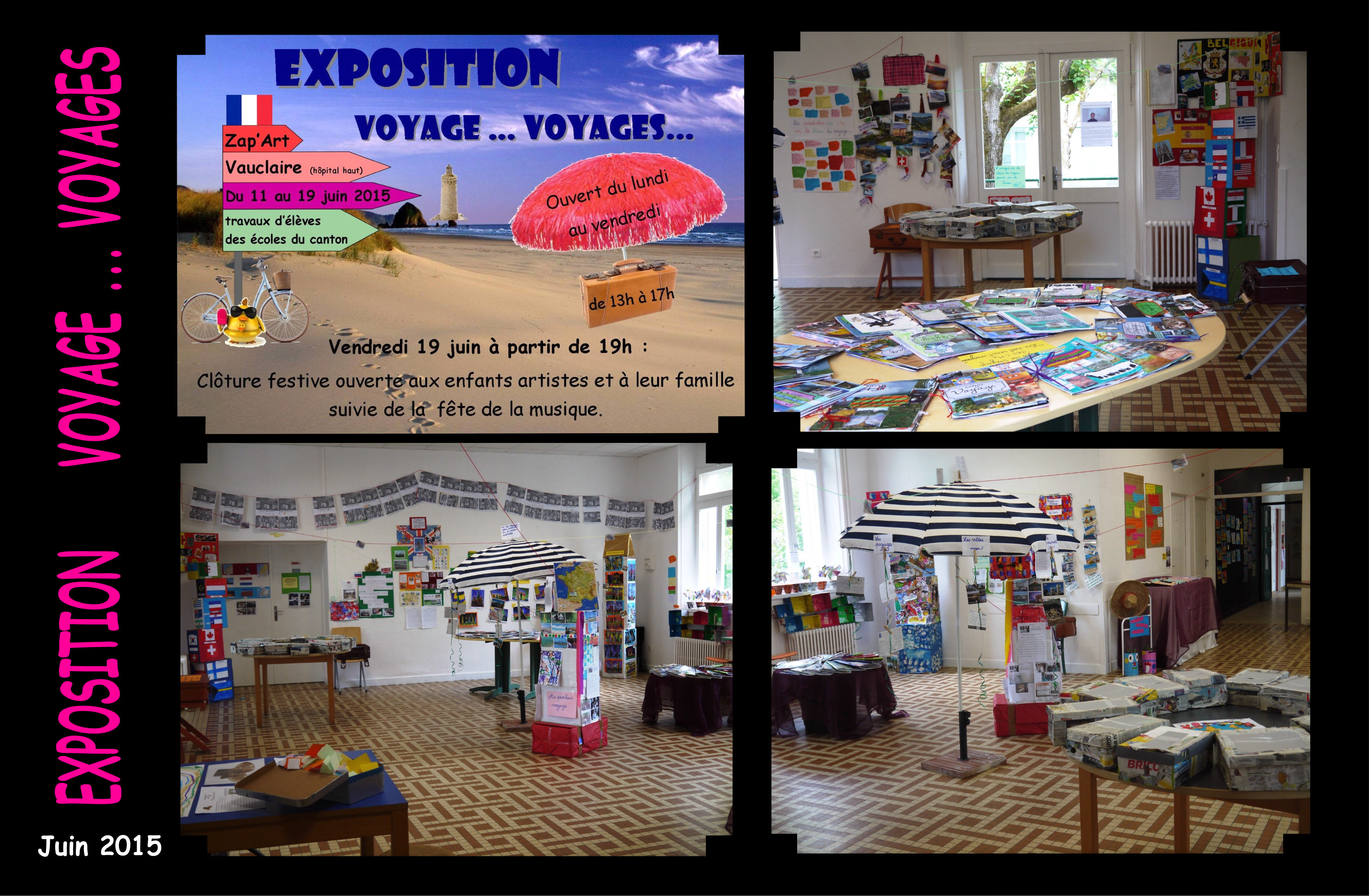 Vous pourrez retrouver, avec plaisir, la magnifique Exposition « Voyage, Voyages », où de nombreux visiteurs ont pu apprécier le fruit d’une année de travail des élèves des écoles du canton autour du projet « Voyage, Voyages »…