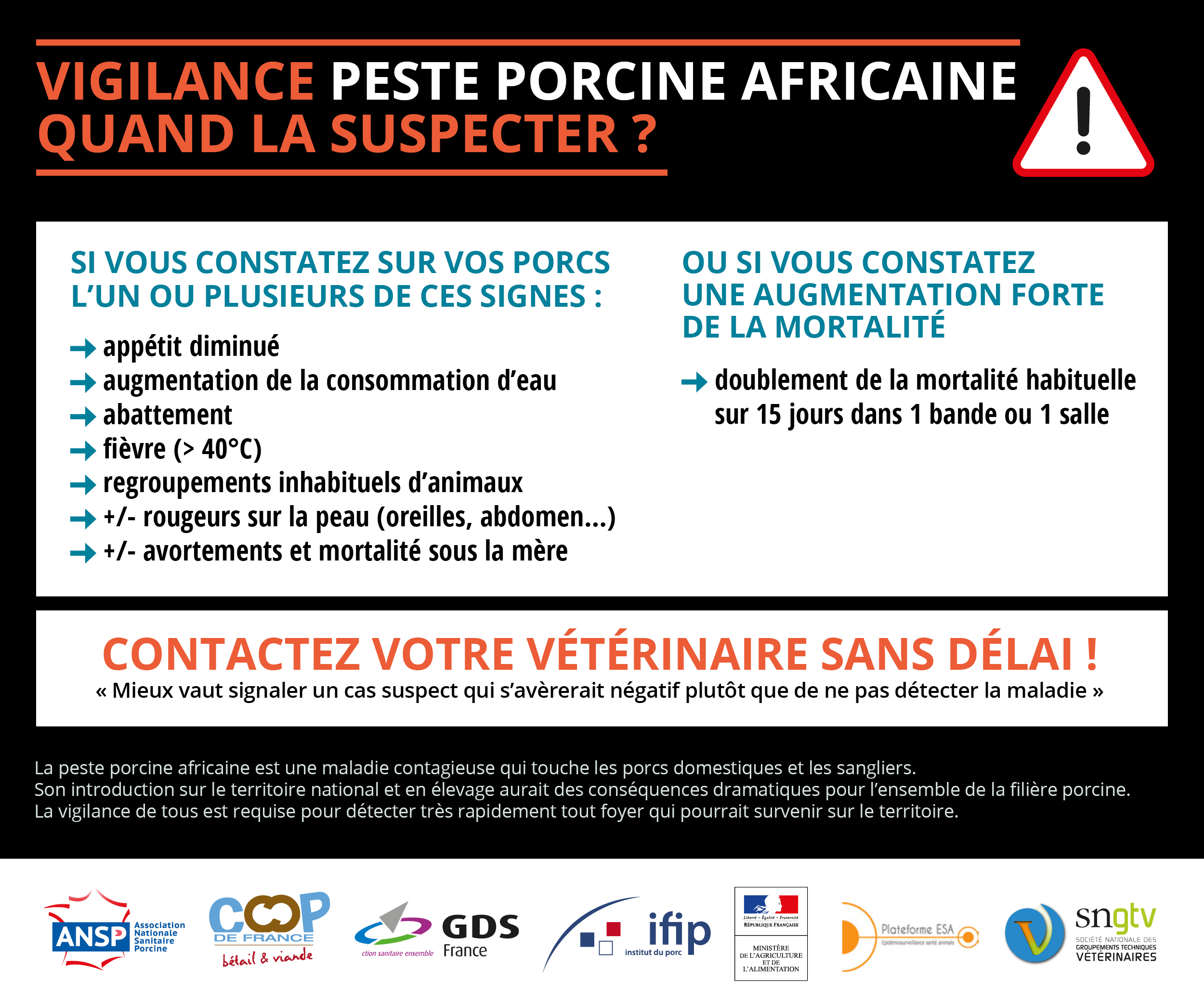 La peste porcine africaine (PPA), est une maladie virale contagieuse des porcs et des sangliers, sans danger pour l’Homme mais avec de graves conséquences pour la santé des animaux et l’économie de la filière porcine.La PPA circule dans plusieurs pays européens et a été confirmée en septembre 2018 en Belgique, chez des sangliers sauvages, près de la frontière française.La PPA se transmet par les animaux infectés, les matériels, les véhicules et les personnes ayant été en contact avec des animaux infectés et aussi par les viandes et charcuteries issues d’animaux infectés.Pour éviter d’introduire la PPA en France et réagir vite en cas de foyer nous vous demandons de: