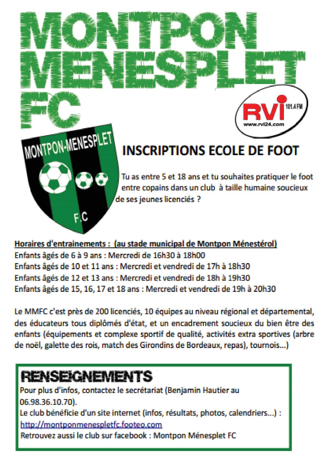 Inscriptions à l'école de foot du MMFC pour les jeunes de 5 à 18 ans et les Horaires d'entraînements Informations et inscriptions auprès du Secrétariat (voir affiche ou renseignements ci-dessous) Voir également le Site du MMFC : http://montponmenespletfc.footeo.com/